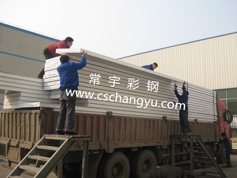 圖為長沙常宇彩鋼出貨阻燃泡沫夾芯板,板長10.115米長。